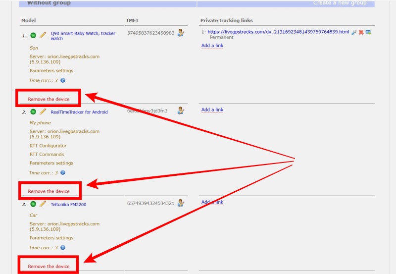 Each connected tracker has a ‘Remove the device’ option.